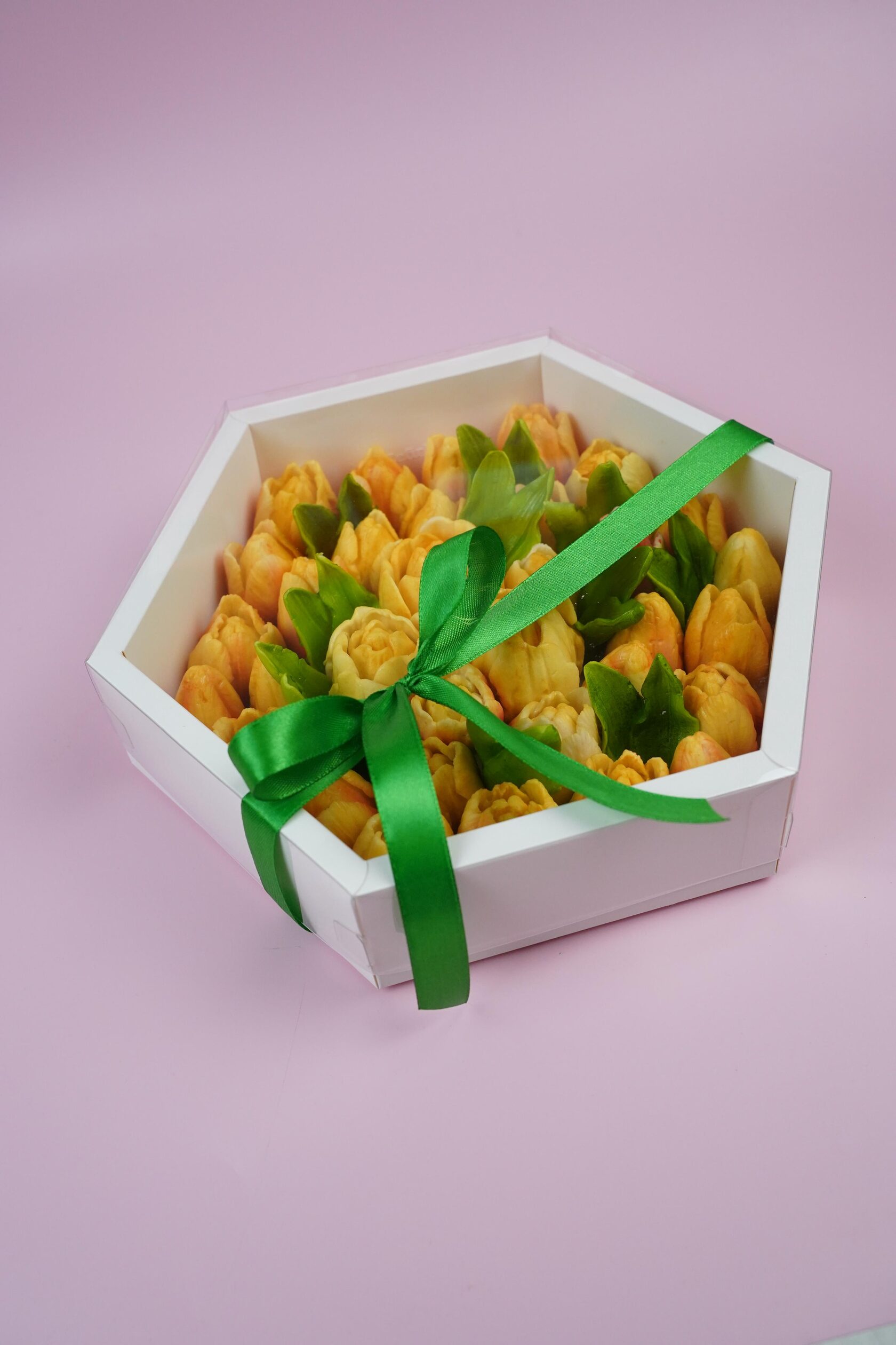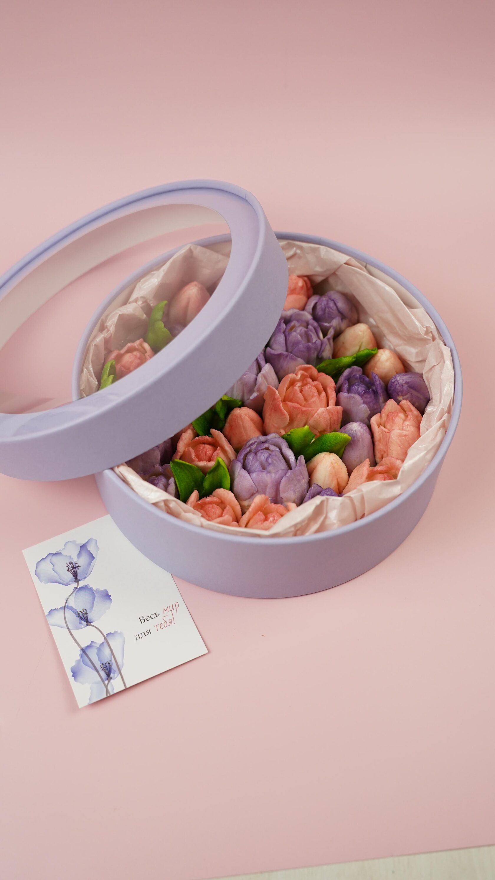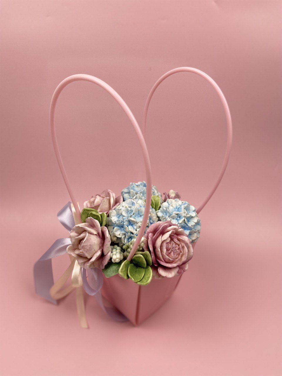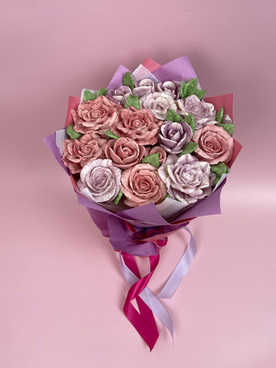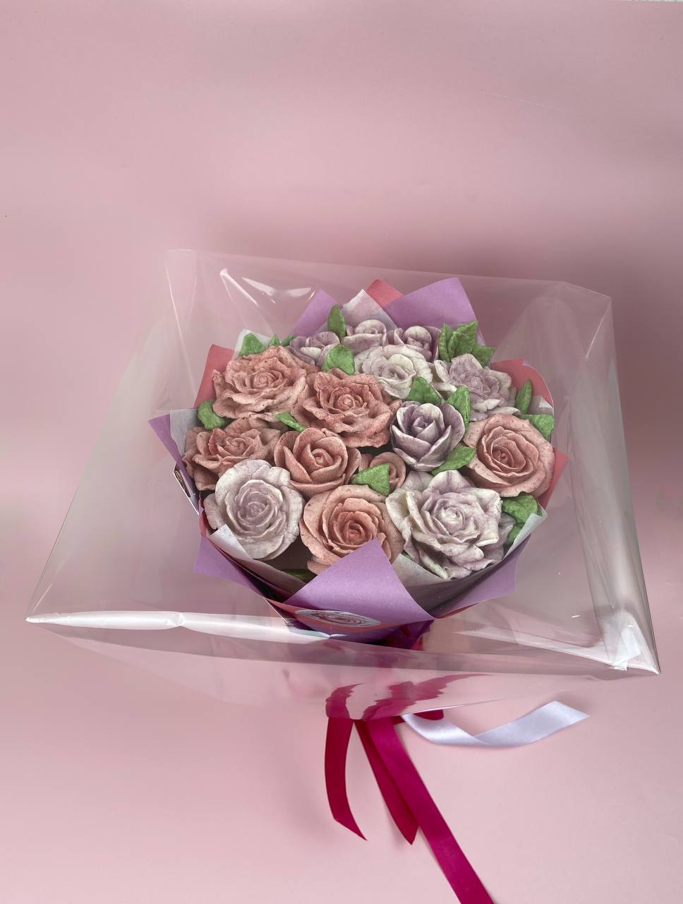 Диаметр букета 21см. Цвет упаковки можно выбрать из наличия.